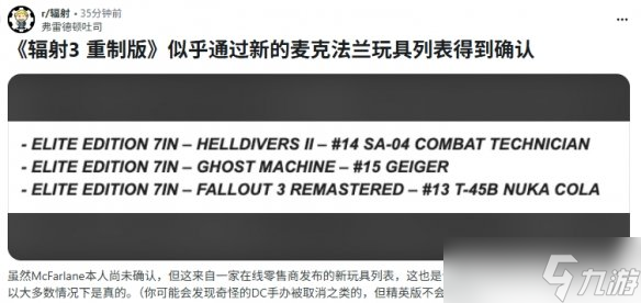 细心的《辐射》粉丝发现了可能证实《辐射3》这部经典之作重制版传闻已久的消息。在专门制作收藏手办的麦克法兰玩具公司近期推出的商品清单中,有一款产品与重制版直接相关。