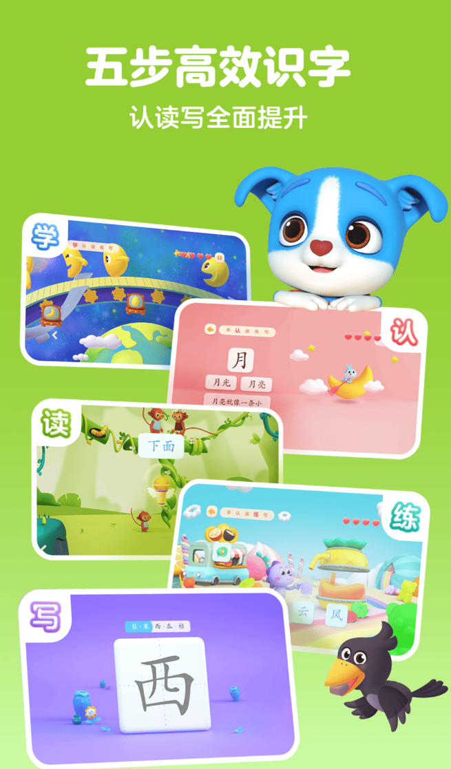 15个关卡160多个识字游戏,孩子跟着剧情走,不会觉得枯燥。象形识字引擎用字形演变动画,展示了汉字来源。科学的进阶引擎,设计了认练、读、写,复习全流程,强化记忆。1200到1500个的常用汉字,配了5500多个词句,75本西游绘本和60本阶梯阅读,帮助过渡到自主阅读。新汉字数量可以调到3到10个,已经会的字,能手动跳过。