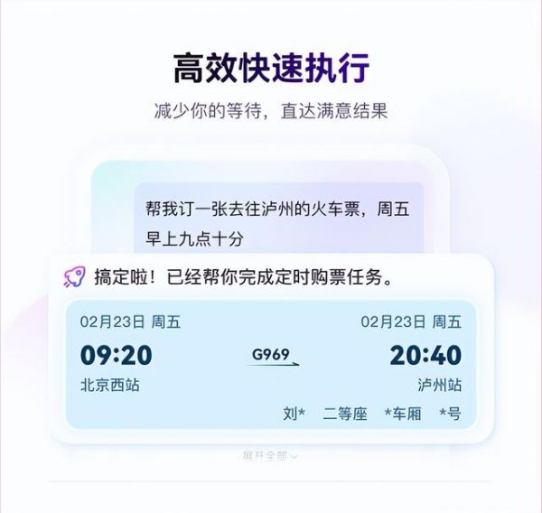 例如,用户只需输入“帮我搜索2月18日北京到长沙价格最低的机票”,系统即可在云端自动完成搜索与下单流程,等待用户确认即可。