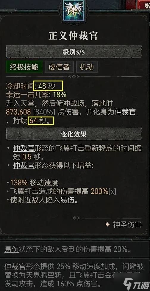 利用【仲裁官】形态的自动飞翼攻击附近敌人,我们施放这个大招。或者在选择了【虔信者誓约】后施放其他虔信者技能,就能变身为仲裁官形态,可以自动施放飞翼对周围进行打击。