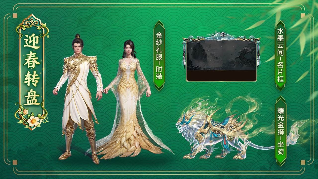 参与抽奖有几率获取替身宝宝自选包,海量金子,全新坐骑幻化——耀光金狮,全新时装——金纱礼服,更有机会获取水墨名片框——水墨云间!!