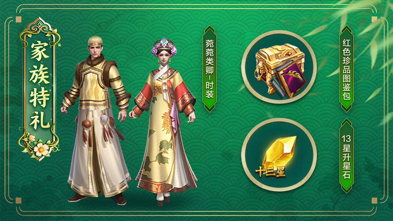 奖励满满来袭,征途融融暖意!全家族收集特礼积分激活奖励,参与活动全家族可获取13星升星石,红色珍品图鉴包以及珍稀返场限定时装——菀菀类卿!!