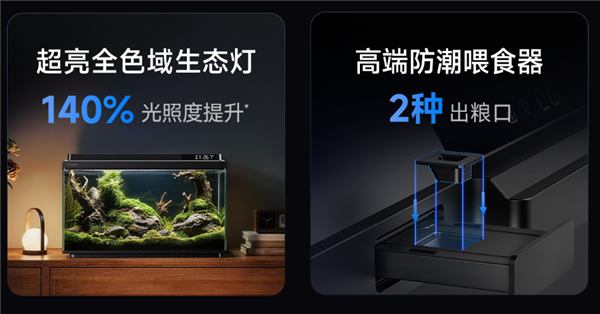 在硬件配置上,当贝智能鱼缸2S Ultra同样实现了全面进阶,超亮全色域生态灯将光照度提升140%,以全色域光谱模拟自然光照,既促进水草光合作用,也让缸内景观更鲜活生动;高端防潮喂食器配备两种出粮口,可适配不同颗粒大小的鱼粮,防潮设计避免粮质变潮,同时能精准控制喂食量,彻底消除用户的后顾之忧。