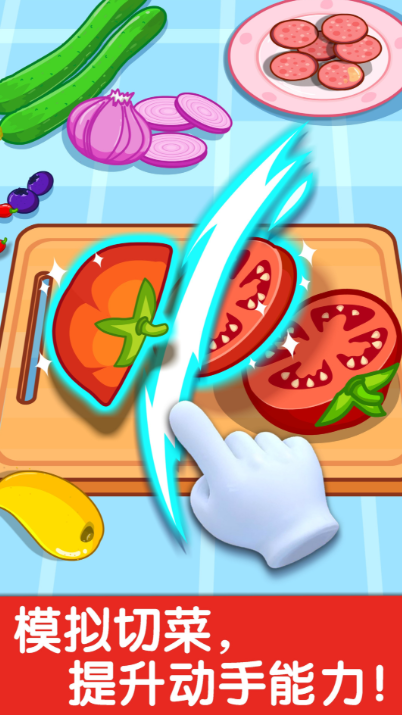 本作以厨房模拟为核心玩法,通过拖拽、拼合等基础手势完成食物制作流程。食材采用标准几何图形呈现:圆形苹果、三角形奶酪、长方形火腿肠,自然融入形状识别训练;色彩明快但不艳烈,保护幼儿视力。每次任务完成后触发音画双重奖励——清脆语音表扬叠加简短动画反馈,有效强化行为动机,帮助孩子建立初步的完成感与自信心。