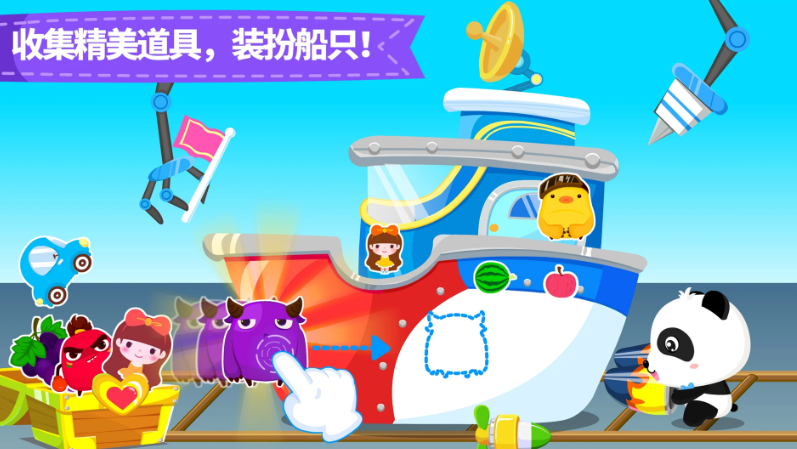 游戏融合舰船设计、任务协作与情境叙事三大模块。儿童可通过简易组件拼装个性化战舰,参与多人协作式航行任务,在过程中理解分工、互助与责任概念;剧情设定融入友善、守约、助人等正向价值引导。整体采用明亮卡通海洋风格,动态水体与光影效果增强沉浸感,兼顾趣味性与早期社会性启蒙目标。