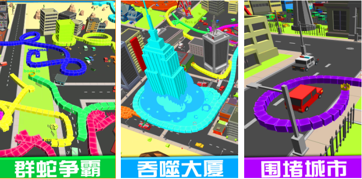 采用三维建模技术打造沉浸式场景,城市街区、沙漠绿洲、海底隧道等多主题地图支持自由切换。支持实时多人同屏对抗,最多可容纳六名玩家同步竞技。抽象艺术风格融合高饱和度配色,视觉辨识度强;蛇体轨迹拖尾、粒子爆炸反馈、环境交互细节增强代入感。每张地图内置专属吞噬规则,例如磁吸加速、镜像分身、重力翻转等机制,显著提升策略维度。