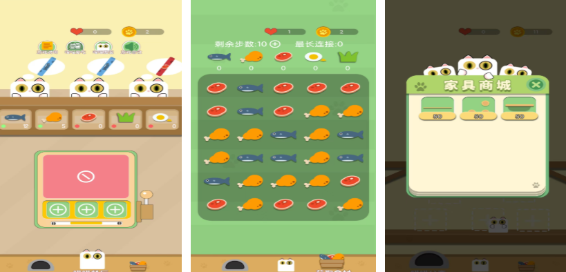 本作以“喵喵餐厅”为起点,围绕猫咪喂养展开合成式成长体系。玩家通过菜单快速获取基础食材,再经三步以内合成操作完成猫条制作,流程简洁直观。每次成功投喂都将推进图鉴进度,解锁新品种猫咪形象及对应公寓装饰组件。所有已获得猫咪均可在主界面自由走动、互动,形成动态化居家陪伴场景。