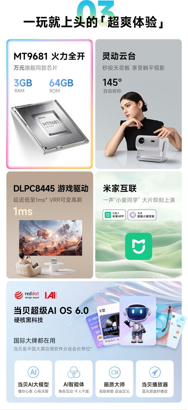 性能方面,当贝D7X Pro搭载MT9681万元旗舰芯片,搭配3GB RAM+64GB ROM超大存储组合,解码4K影片流畅不卡顿,多APP切换毫无压力。针对游戏玩家,产品做了专属优化,采用DLP C8445游戏驱动技术将延迟降至1ms,支持240Hz高刷与VRR可变刷新率,操作丝滑跟手,沉浸式游戏体验拉满,真正实现观影游戏双全能。
