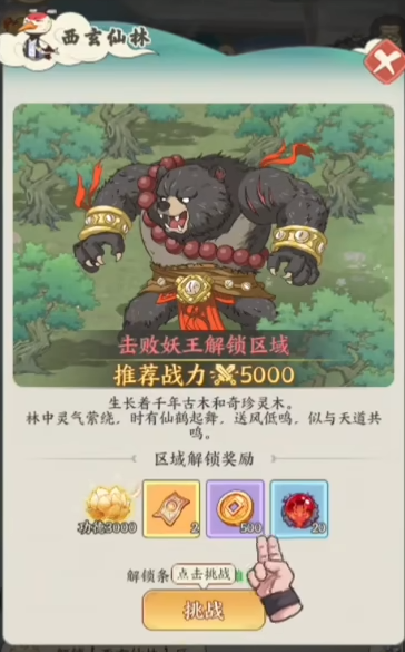 首个开放的新区域为西玄仙林,该地盘踞着初始守关Boss——西玄妖王。此战为玩家首场PVE战斗,难度适中,建议战力达到5000即可稳定通关。妖王血量较厚,需合理安排技能释放节奏,战斗胜利后可获得资源奖励并正式解锁该地图。根据区域特性可知,西玄仙林盛产灵木,而手串制作正依赖此类材料,因此本阶段需集中开展灵木采集任务。