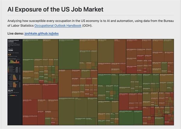 3月16日消息,据报道,近日,OpenAI联合创始人安德烈・卡帕西借助AI技术,结合美国劳工统计局的相关数据,对美国各职业受人工智能与自动化技术冲击的脆弱程度展开评估。