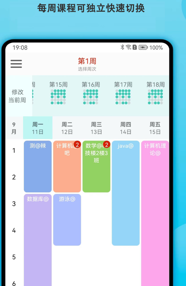 上课时间和节数都可以自己设定,不用迁就软件默认的时间段,跟学校实际作息对得上。单双周乃至多周的重复课程,设置一次就能自动排好,不用一节一节重复录入。提醒系统分两层,一层是课程提醒,提前二十分钟以闹钟形式推送,另一层是考试专属闹钟,可以单独配置。课程信息支持批量修改,学期中途调课也不麻烦。