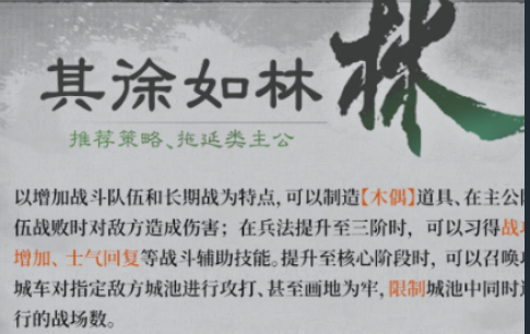 想要稳扎稳打,就可以选择其徐如林,主要靠的就是战车系统,还有木偶道具,就算己方部队溃退,也可以反手给敌方一波强力的反杀。兵法升到三阶,战功加成,还有士气回复的辅助技能就可以解锁,续航还有收益就会双提升。进入到核心的阶段,可以召唤攻城车去硬刚敌方的城池,同时也可以放画地为牢去限制敌方的次数。在打长期战时真的还是比较合适的,可以有效压低对手的操作空间。