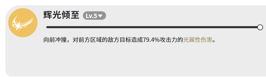 第二个技能是辉光倾至。5级的时候,目绒兔会向前冲撞,对前方区域的敌方,造成79.4%攻击力的光属性伤害。这个技能的伤害倍率,在缓冲型角色里算是不低的了。目绒兔本身攻击力不是主要培养方向,但这个技能,至少让它在输出上不是完全摆设。冲撞的范围是前方区域,打群怪的时候,能同时命中好几个,用起来还算顺手。