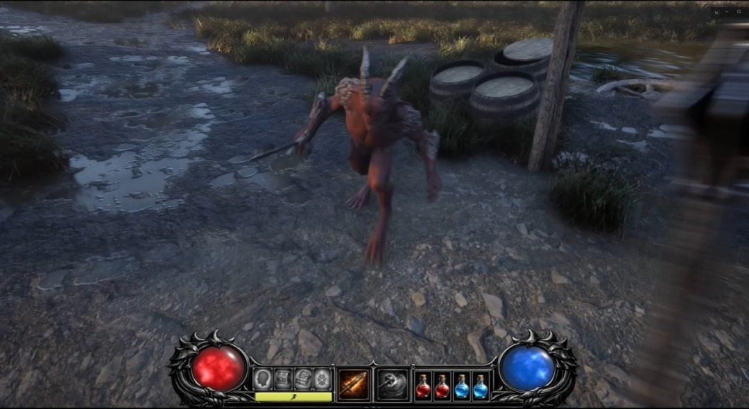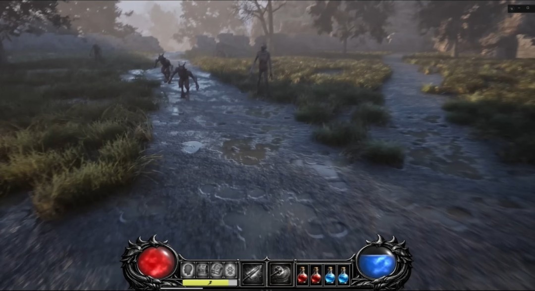 在这段短片中,野蛮人正与僵尸和恶魔小鬼战斗。游戏包含了基础HUD界面,其中有可用的经验条、技能栏、药水和耐力条。并且该同人版本的外观和感觉已经相当出色。敌人受击的反馈和动画都相当不错。攻击没有"漂移感",这也是一个很大的优点。