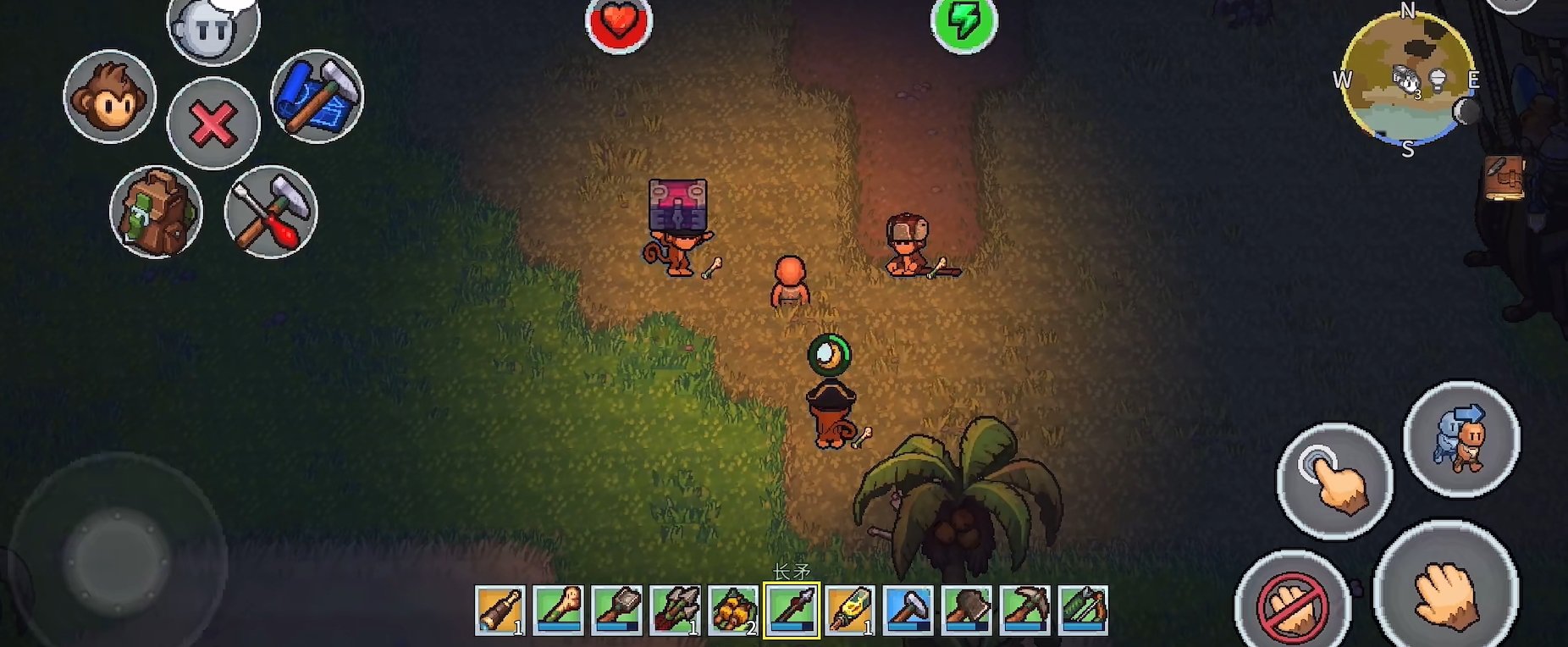 夜间环境带来独特挑战——黑暗中潜伏着多种敌对生物,仅靠徒手难以应对。此时装备系统便成为关键:打造护甲、锻造武器、调配火把,是保障安全的基础。更富创意的是“灵猴伙伴”机制:解救被囚禁的野生猴子后,它将主动追随玩家,并智能复刻你的动作——你挥斧伐木,它同步挥爪劈枝;你持矛迎敌,它立刻扑咬干扰。你还能为其定制专属装备,强化其防御与攻击属性,使其成长为可信赖的战斗协作者与生活助手。
