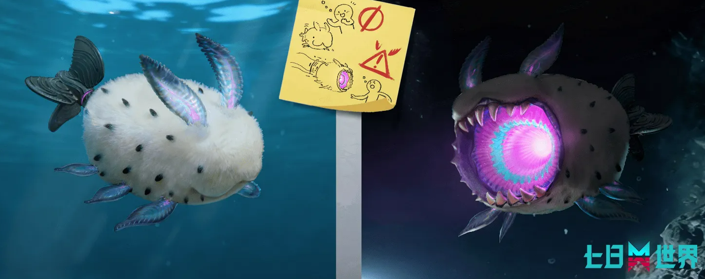 第二种新怪物是海兔。这个名字听起来挺可爱的,外形也确实有点萌。它的身体是猕猴桃那种形状,颜色灰白,长了三对鳍用来游泳,头上有两个像兔耳朵一样的突起,嘴巴是兔唇的样子。尾巴那里比较特别,原本应该是生物结构的部分,已经完全变成了螺旋桨形状的器官。