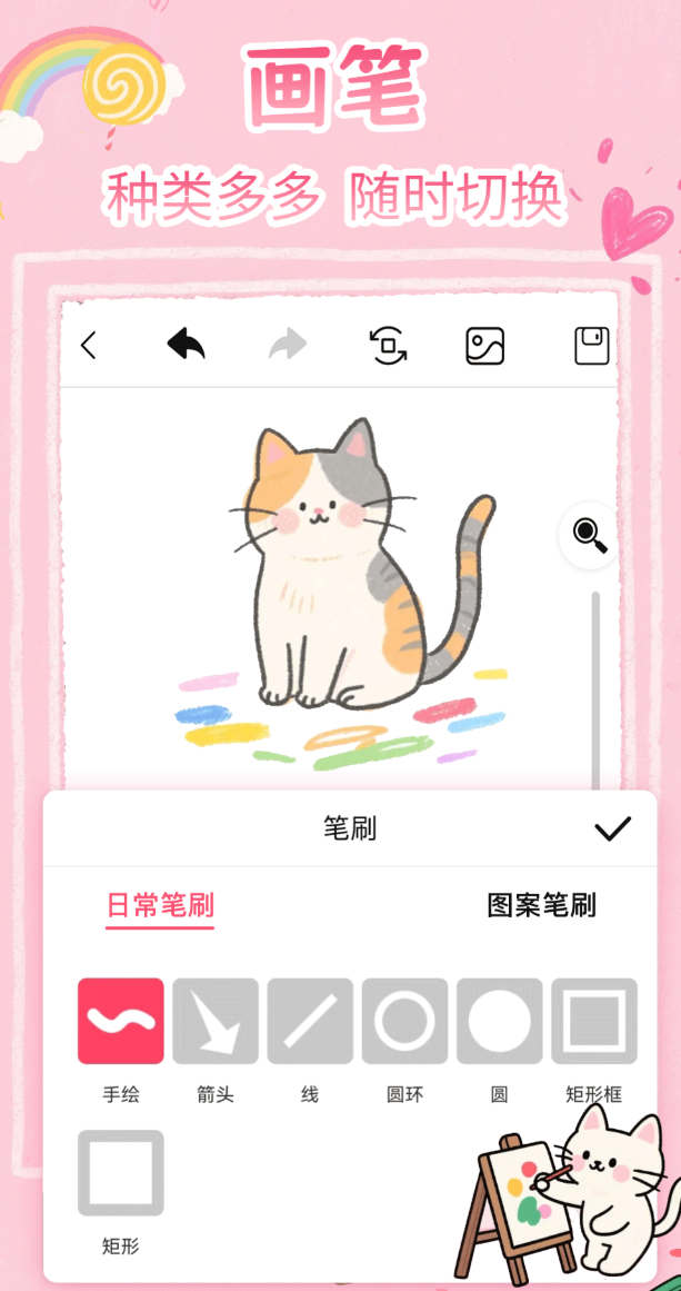 支持自由涂鸦与智能填色双模式无缝切换,适配从涂鸦探索期到图像识别强化期的不同发展阶段。自由画布无边界限制,支持普通笔刷、图案笔刷与背景色填充三类绘制方式;橡皮擦响应灵敏,修改操作零延迟。填色模块内置超60个主题素材包,涵盖生活用品、史前生物、幻想角色等多元题材,依托高精度区域识别技术,实现单点触控自动上色,颜色严格限定在线稿范围内,杜绝溢出问题。