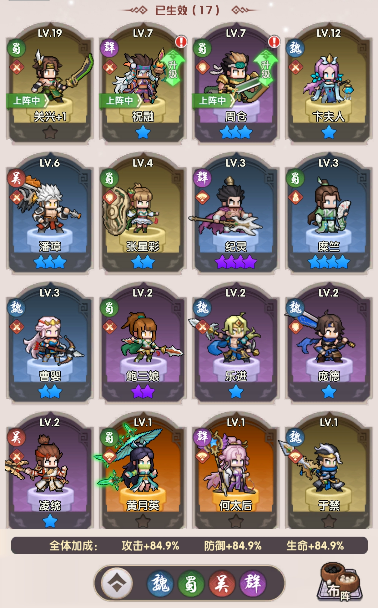 装备为全体武将共享生效,无需单独配置,击杀怪物可掉落 12 种+品质的装备,通过穿戴、替换、分解系统灵活优化属性,装备属性实时刷新,战力提升可视化呈现。六宫格布阵搭配魏蜀吴神魔阵营光环,上阵指定数量武将可激活额外属性加成,策略性拉满。