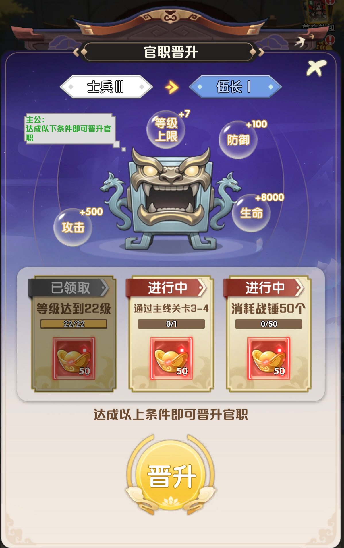 当三大任务全部达成,晋升按钮将解锁金色状态,点击即可触发炫酷爆开特效,泡泡聚拢后呈现属性加成界面。晋升后不仅能解锁等级上限,还能获得攻击、防御、生命等全方位属性增幅,官职名称随品质解锁对应专属颜色,仪式感拉满。清晰的成长路径、丰厚的进阶回报与炫酷的视觉体验,让每一次晋升都成为值得期待的高光时刻!