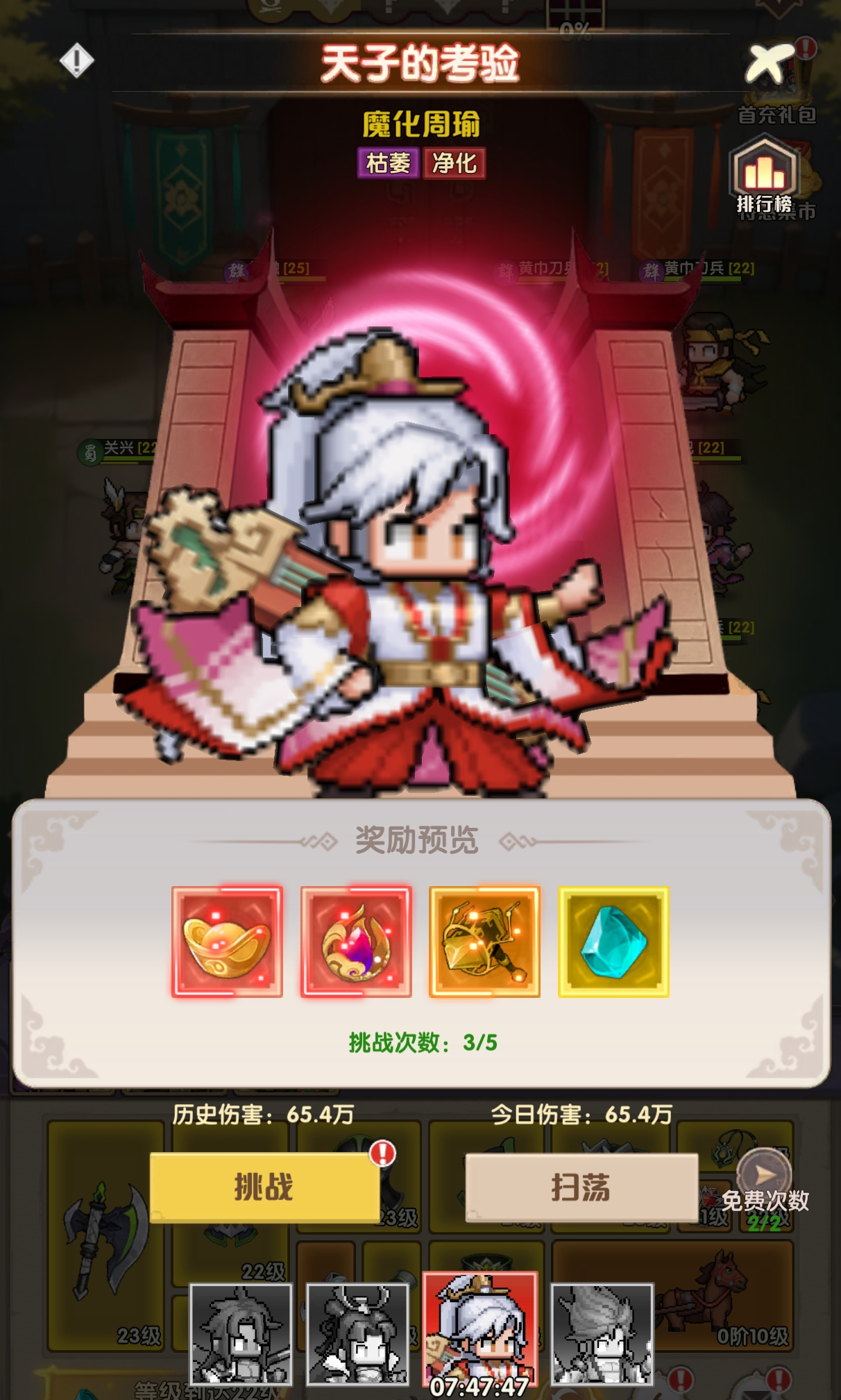 天子的考验是《像素三国》趣味十足的每日 BOSS 挑战 PVE 玩法,主打策略搭配与多队伍培养,带来新鲜感满满的讨伐体验!玩法每日轮换不同特性的 BOSS,每只 BOSS 拥有专属属性、技能与模型,需根据其特性灵活调整上阵武将。