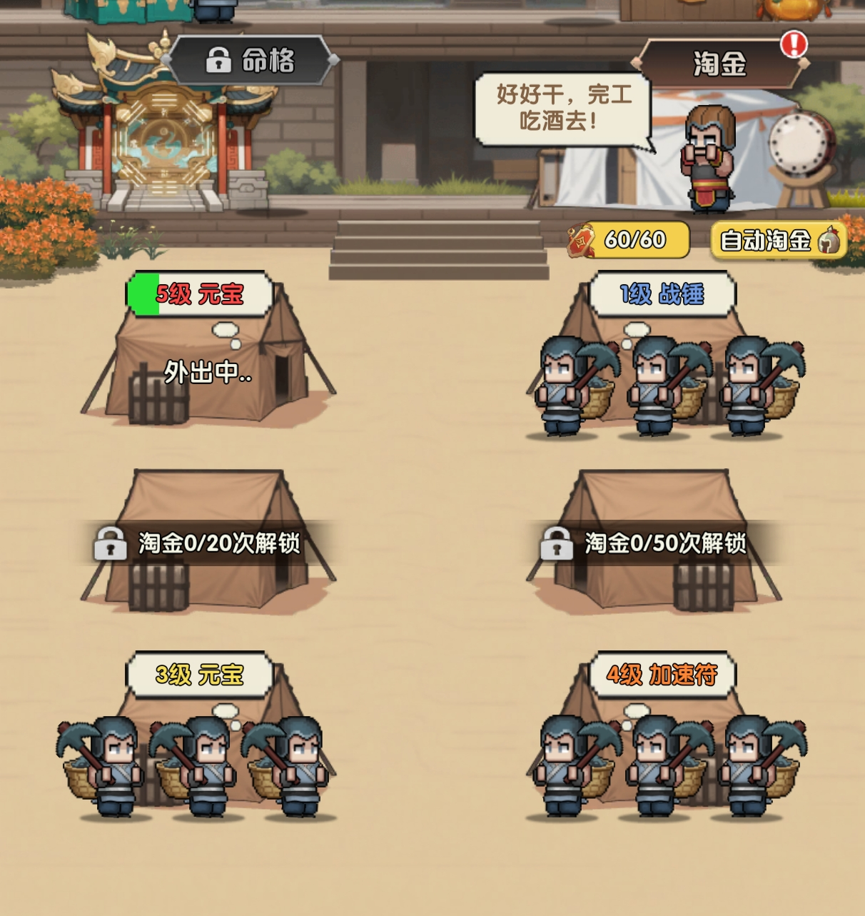 淘金系统是《像素三国》核心内政玩法,以低门槛高回报的资源供给为核心,让玩家轻松积累养成材料!解锁后可通过内政界面进入,默认开放 2 个营地和 2 名监工,剩余营地与监工可通过淘金次数或金币解锁,最多可达 6 个营地、6 名监工。