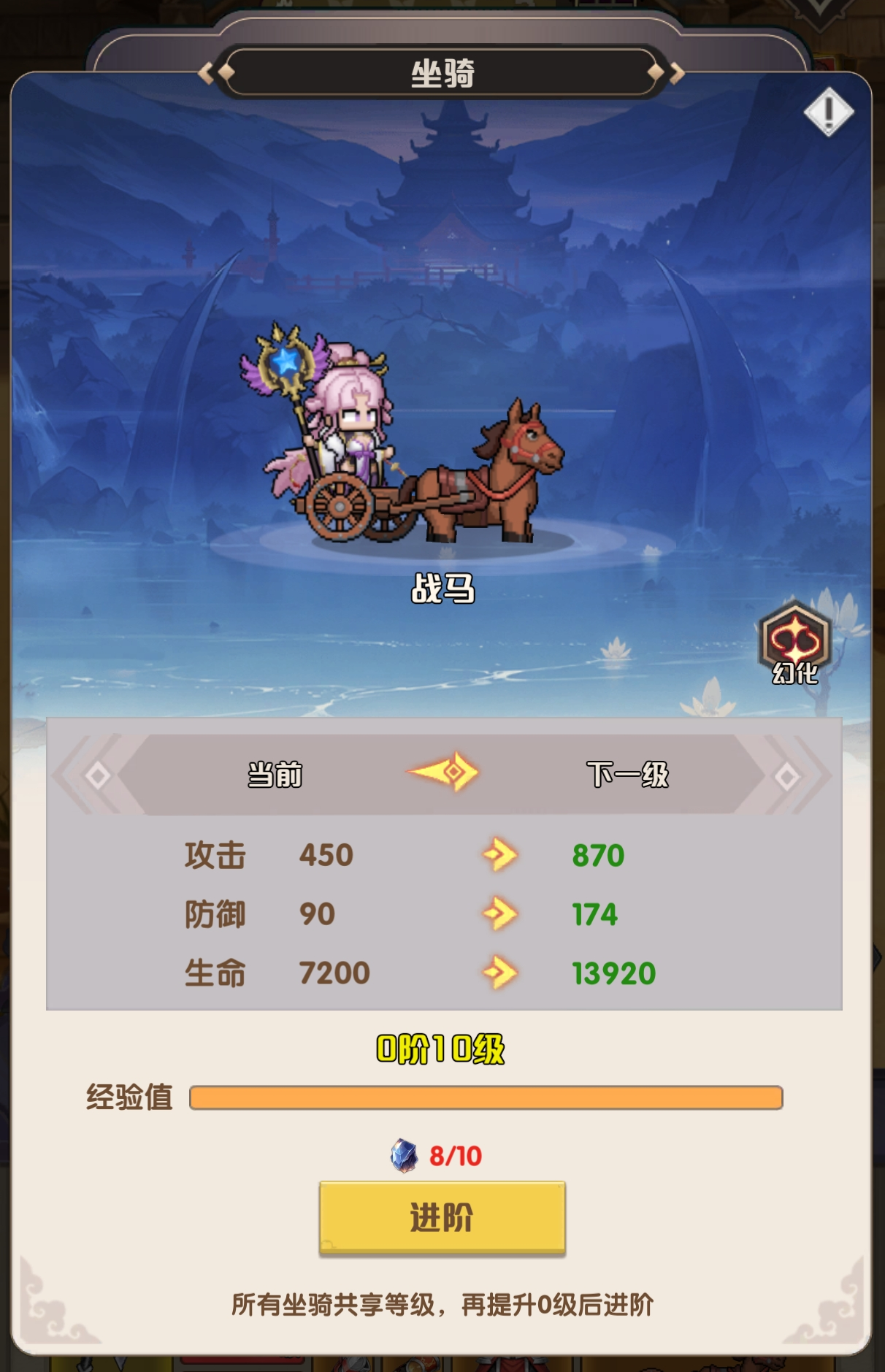 玩法核心包含进阶与幻化两大模块:消耗升级道具提升等级,满级后可消耗进阶道具突破阶级,阶级越高属性加成越强,特殊属性同步升级。幻化系统提供多样坐骑外观,可通过系统解锁、阶级达成或活动获取,部分外观自带额外属性,重复获得可升级叠加效果。