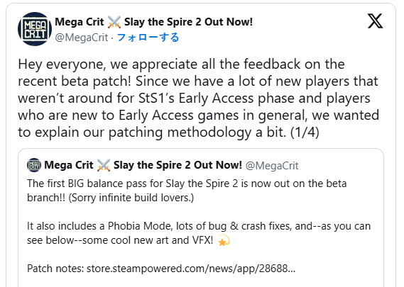 好评卡牌战斗游戏《杀戮尖塔2》目前正在抢先体验中,3月20日官方发布了首个大型补丁,没想到引发玩家强烈不满,从原本几乎无差评状态直接暴增9781件差评。