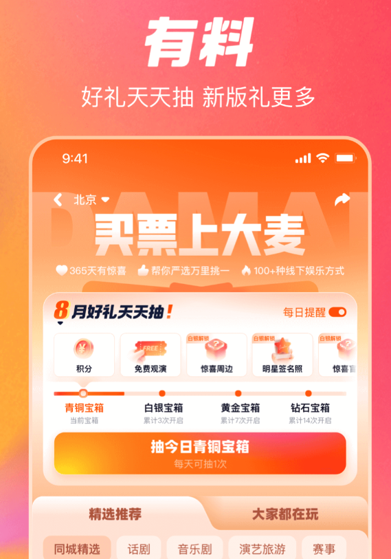 演唱会、音乐节、脱口秀、体育赛事,大麦把现场娱乐的品类铺得很开,40多个细分方向都有涉及。抢票系统的稳定性是用户提得比较多的优点,先抢后付的机制减少了因为犹豫而错过的情况,同一项目多票价合并支付也省去了分开操作的麻烦。推荐系统根据用户的喜好来筛选演出内容,不用自己一条条翻,决策效率提高了不少。