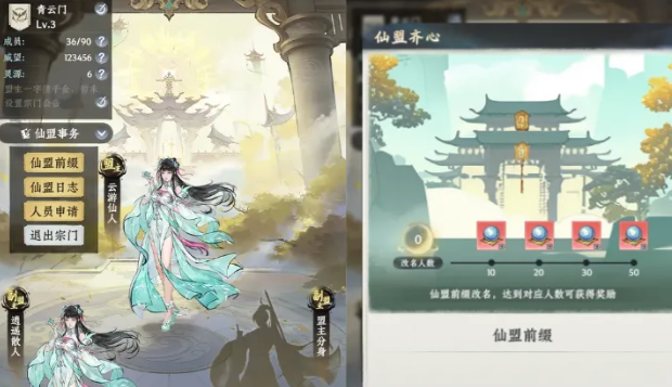仙盟的成长就是从每日祈福开始。在祈福店里面一个人一个愿望,通过免费祈福,就可以获得贡献以及威望。个人贡献就可以去兑换藏宝阁的珍宝,威望还可以支撑宗门等级,只是这一份成长从来都不是一人之功。每日的威望都是有上限的,只有全盟同心,才可以让宗门走得又快又稳。盟主可以控制资源,然后去升级大殿,每一次的升级全部都是宗门底蕴的沉淀。万灵大阵就是仙盟的立派根本,盟主以及副盟主就可以迅速的起到引领效果,快速的升级。每一次升级,全体的成员都会多一份属性加成。