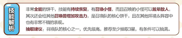 把这几个技能加在一起看,棉花饼干其实是一个很全面的饼干。回血、增益、召唤、控制,这四个方向它都沾到了。在召唤队里,它基本上是核心位置,少了它整个队伍的节奏会差很多。不过就算不是专门跑召唤队,棉花饼干放在其他阵容里也不会显得格格不入,适应性还是比较强的。