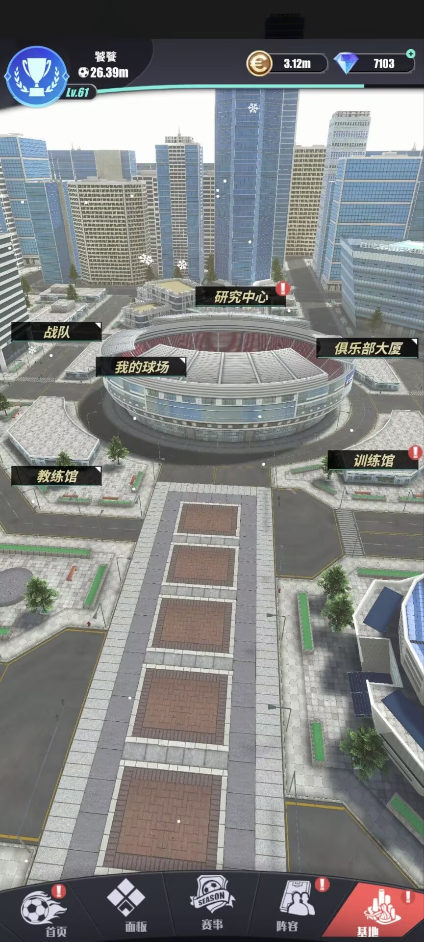 游戏界面右下角,点击基地可进入基地界面。共有战队、我的球场、研究中心、俱乐部大厦、教练馆、训练馆等6项内容。每一个点进去左上角都有一个小问号,详细讲述各项内容的玩法。战队及教练馆应该有很多攻略了,这里不再细说。重点分享一下我对我的球场、俱乐部大厦、研究中心以及训练馆的玩法。