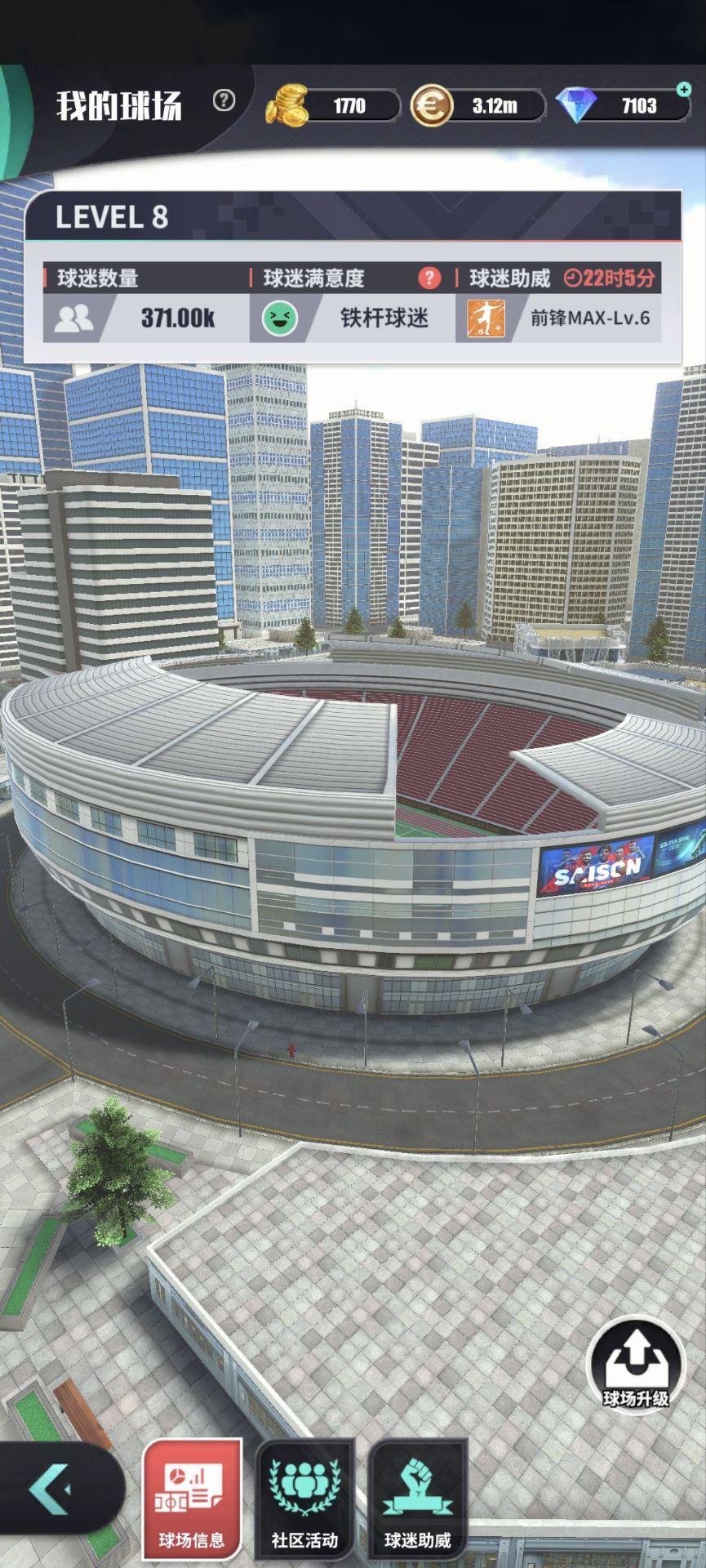 我的球场:是基地其他内容升级的前置条件。其他可升级建筑不能超过球场等级,球场等级和挂机收益直接挂钩,所以我的球场是能升多高就升多高,开服时建议直升4或5,生涯赛卡关后,再去领取挂机收益,尽量做到收益最大化!