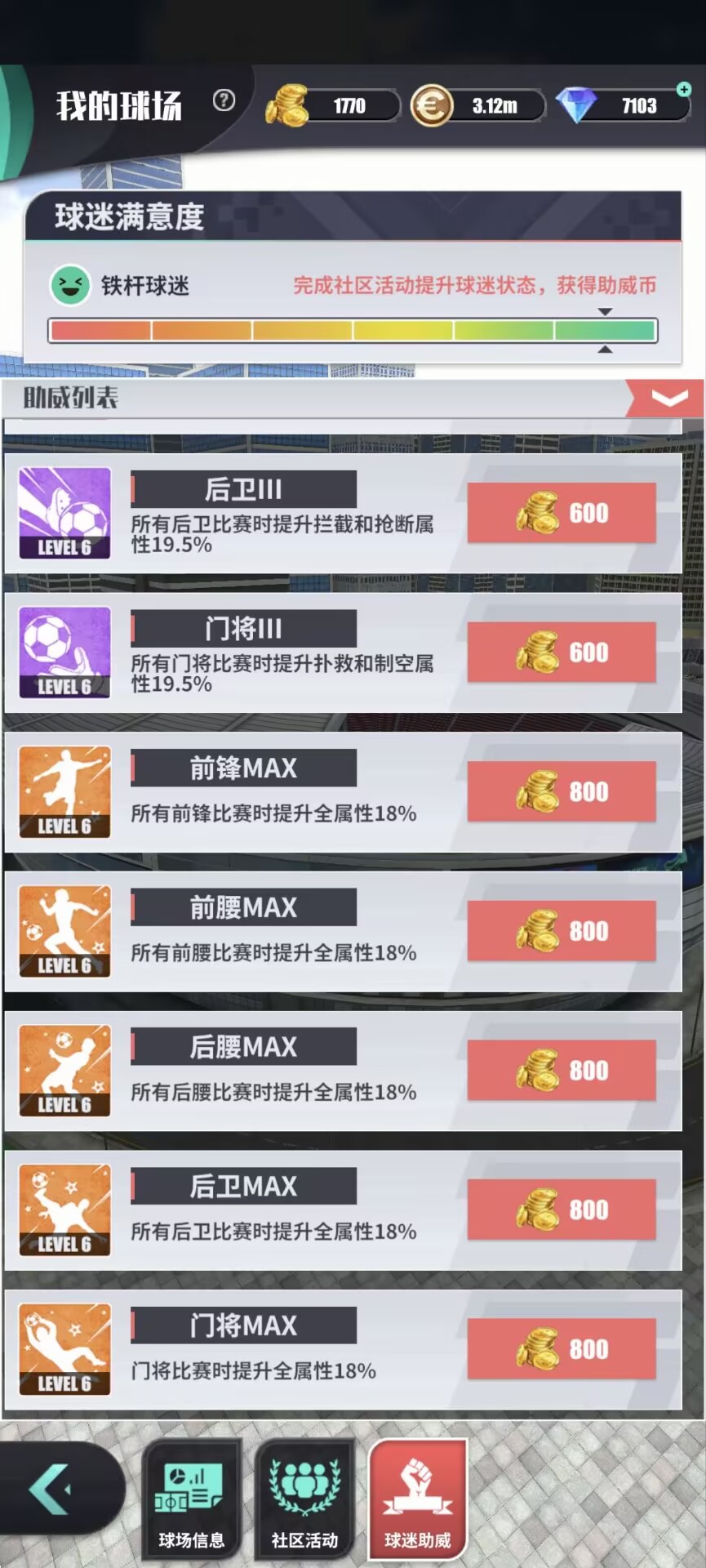 营运资金,在球场内正上方左侧显示,这也是一个非常重要的资源!在与其他玩家交流时,发现有的玩家不知道营运资金如何使用,甚至攒了几万,没有转化为战力提升,着实有点浪费。其实使用营运资金可以提升即时战力和获得很多基础资源。比如球迷助威中,花费800运营资金,在球迷满意度为铁杆球迷时,为某单个位置提升全属性18%。因为只能提升单个位置,所以哪个位置球员多,就提升哪个。因为我是3223阵容,前锋最多,所以我助威的是前锋,其他有4后卫、5后卫阵型的也可以提升后卫,门将不建议提升,因为只有一个,收益太少。