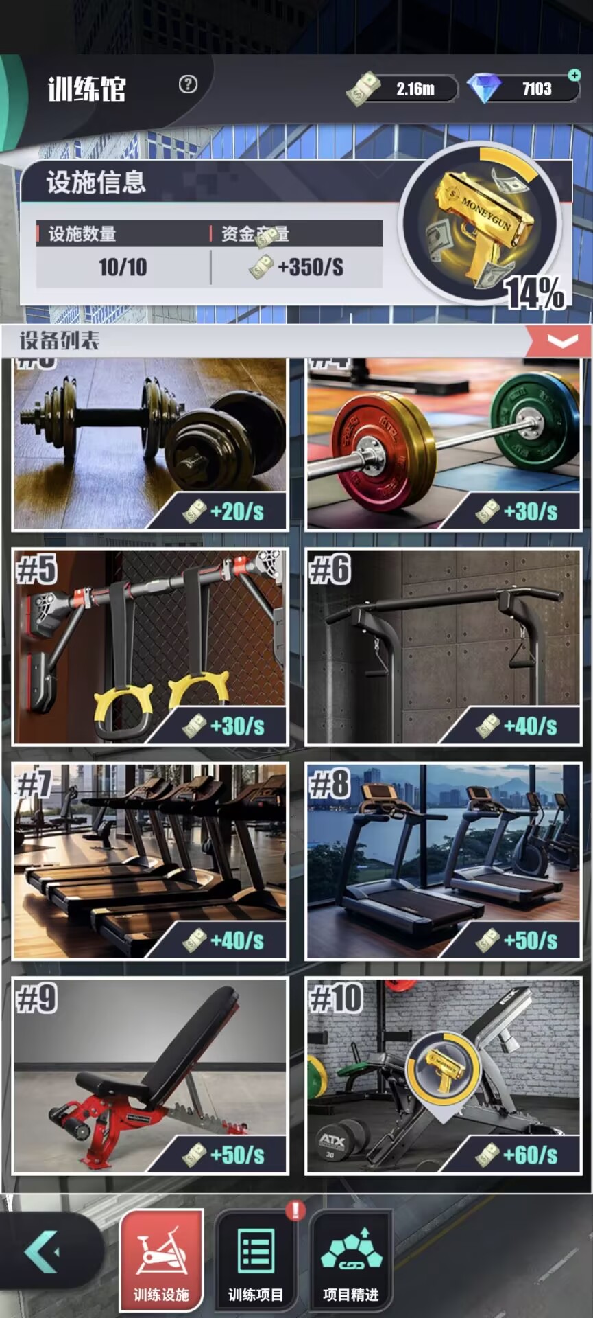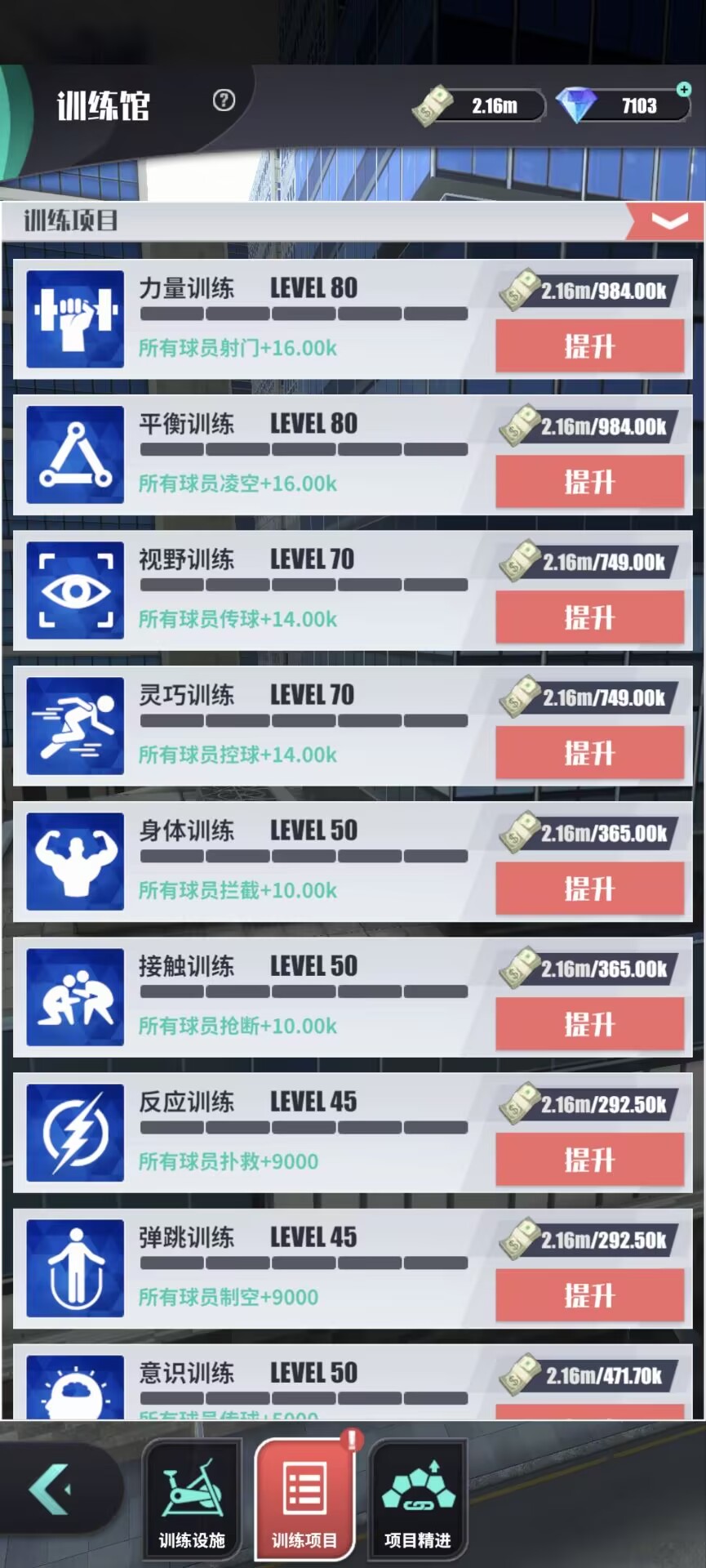 训练馆:训练设施共10项,开区时建议憋到前8项,然后根据开区活动提升训练项目,单个升到70,其他升到30左右,就可以升第9项和第10项了。我是把力量训练升到了70级,提升的是射门,100级需要的资源太高,实在是升不动。钞票枪,达到S级,固定给30K的训练资金,达到一次之后就可以跳过。我是点击开始之后,除了大拇指,其他8个手指都上去一顿狂点,轻松过200,实现S级SO easy。