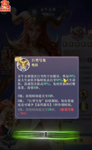 最后那自然就是选择金牛女神,这就是一个全能型的卡牌,强度是很不错的,有输出有控制,有坦度。金牛女神的强势体现在多个方面,有高额的回血效果,还有实用的控制能力,以及打断技能。敌方在准备开大招时,一个打断就可以让对方的蓄力全部白费,加上眩晕的效果,那控场的能力还是比较出色的。另外他的坦度堪称天花板,带上专属的神器,就可以获得90%的免伤效果,即便是这个效果在5秒内迅速的衰减,那也可以抵抗大部分的伤害。