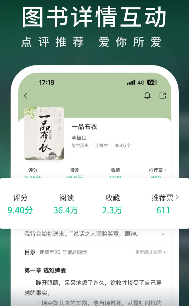 《狂飙》《流浪地球》的原版小说也抢先上线过,影视原著资源的时效性不错。章说和段评系统比较有意思,可以在具体段落旁边发评论,读到精彩处直接和其他读者交流,不用跳出去找帖子。剧情共创活动让读者能投票影响故事走向,创作直播间可以看作者实时写作,参与感比普通阅读平台强不少。平台无广告,打赏和投票功能让读者和作者之间的互动更直接。