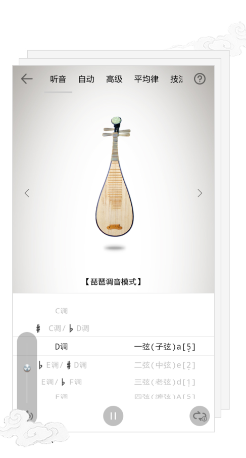 专门为琵琶设计,基于真实音色采样做的算法,识别定弦的准确度比通用调音工具稳定不少。调音模式分了五种,听音、自动定弦、高级调音、十二平均律和技法模式,覆盖了从入门练习到专业演出的不同场景。基准音可以选琵琶、三十六簧笙、三角钢琴或扬琴,节拍器的音源由专业打击乐演奏家录制,击鼓锤、木鱼、踩镲等七种音色,节奏质感和通用提示音比完全不同。