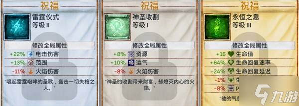 属性选择电击伤害(狱火大剑选火焰伤害),生存类属性(生命回复,护甲,闪避),资源类属性(运气,资源,经验获取)。