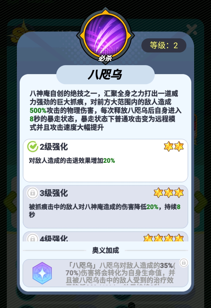 在一种御守格斗家中,八神庵的强度很不错,他不光在释放战技后能获得较高的普攻倍率,而且还能附带减疗效果,解锁了奥义加成后,战技带来的强化普攻效果更是能将伤害转化为自身的血量,可进一步提高他自身的坦度。释放必杀时除了能对敌方目标造成高倍率的伤害外,自身也会立刻进入持续8秒的狂暴状态,普攻也将变成远程攻击,攻速更是会大幅提升,配合上他自身的击退能力,能将敌人的活动空间压制得非常小。
