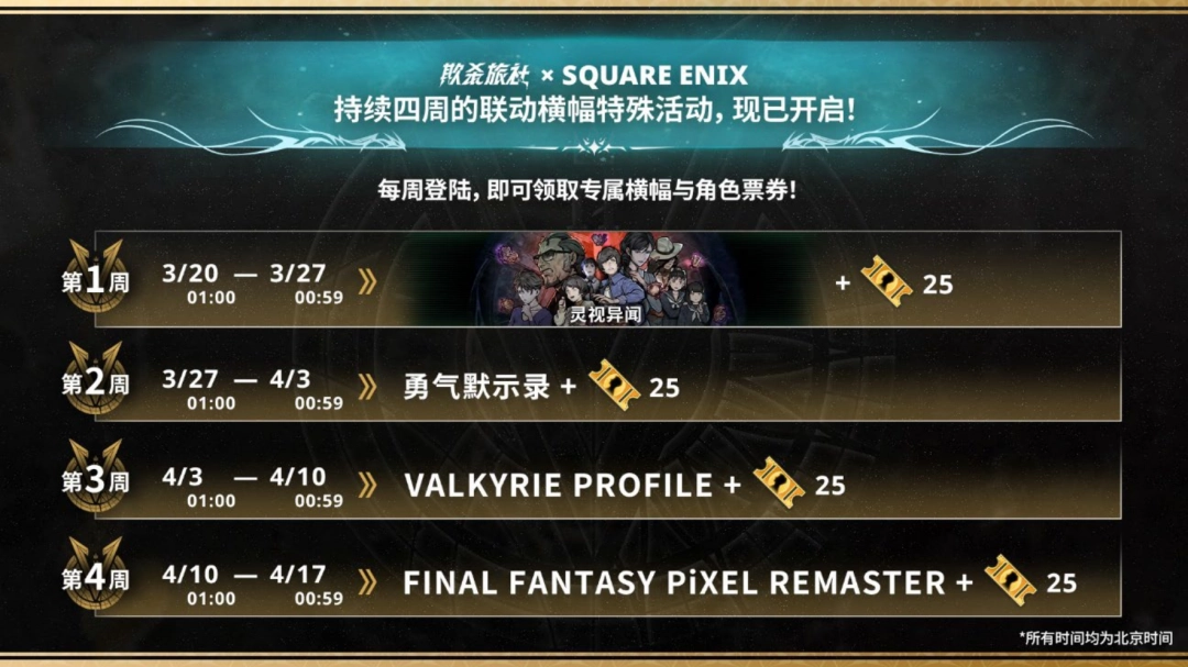 活动期间将连续四周赠送与 SQUARE ENIX 旗下作品联动的限定横幅及角色券。每周登录《欺杀旅社》即可领取对应奖励。《灵视异闻》