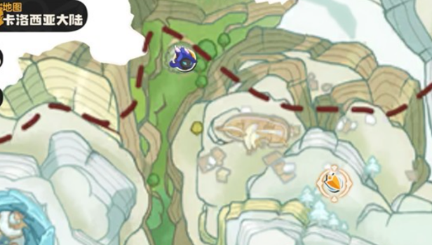 想要抓到雪影娃娃,首先得去卡洛西亚大陆的星霜崖。这个地方在地图上有标记,跟着导航走就能找到。到了之后,会看到场景中间,有棵比较特别的树苗,不过这棵树苗不能直接点,得先把风眠省的图鉴考核等级,刷到40级才行。等级不够的话,树苗根本没反应。所以如果发现点不了,就先去把图鉴等级提上来。