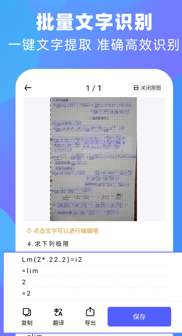 采用端侧智能识别技术,支持区域框选式提取,操作步骤精简直观。官方标注综合识别准确率高于99%,在司法文书、医疗病历、金融合同等高严谨性文本处理中验证有效。兼容印刷体、连笔手写、行业专用符号及用户自定义模板。支持多图批量导入,一次性完成识别与结构化输出。内置实时翻译模块,识别结果可一键切换中英日韩等十余种语言,无需跳转第三方翻译工具。