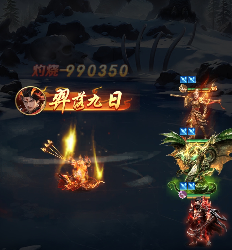 羿落九日是后羿的怒气技能,更是他的核心技。在发动时后羿可直接对敌方后排造成伤害,并且当敌方后排人数较少时,每少一个目标都能让羿落九日的伤害增加20%,至多能增加到40%,所以即便双方在对战中拼到后期,在各自阵容都处于残阵的情况下,后羿也能凭借这一机制,对敌方单体目标造成高额杀伤,有着极强的残局处理能力。此外,若是后羿能搭配嫦娥一起上阵,那后羿还能享受到攻击加15%的羁绊效果,所能造成的伤害会更夸张。