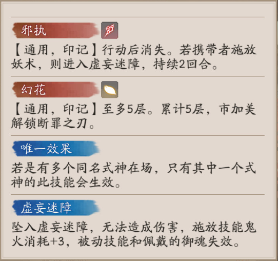坠入虚妄迷障,无法造成伤害,施放技能鬼火消耗+3,被动技能和佩戴的御魂失效。