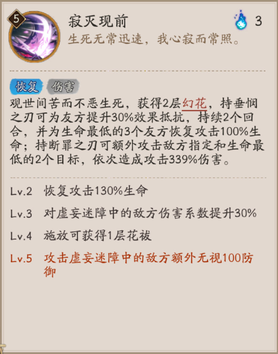 观世间苦而不恶生死,获得2层幻花,持垂悯之刃可为友方提升30%效果抵抗,持续2个回合,并为生命最低的3个友方恢复攻击100%生命;持断罪之刃可额外攻击敌方指定和生命最低的2个目标,依次造成攻击339%伤害。