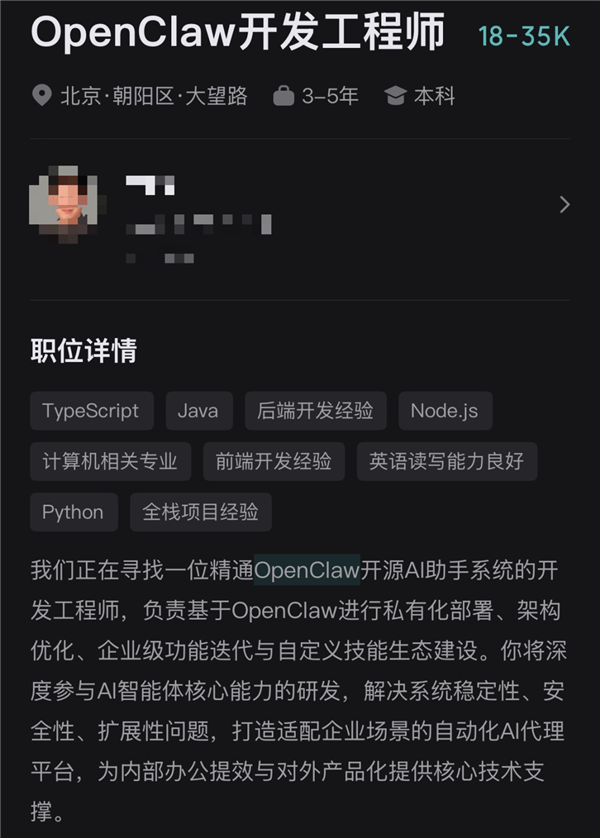 如果说CCO这样的岗位其实更偏向于对Agent工程师/Agent技术负责人的「龙虾化」包装,还有另一类工作岗位,更聚焦于OpenClaw本身。