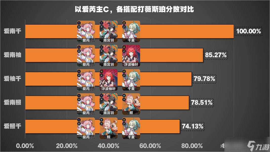 爱芮、南宫羽、千夏做基础100%;爱南柚为85%;爱南照为78.5%;在南宫出现之前,表现比较好的爱柚千也就只有79.7%;而爱照千则为74%。