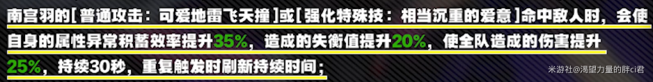 南宫羽的蓄力普攻、强特命中敌人时,使自身异常积蓄效率提高35%,失衡值提升20%,全队增伤25%。
