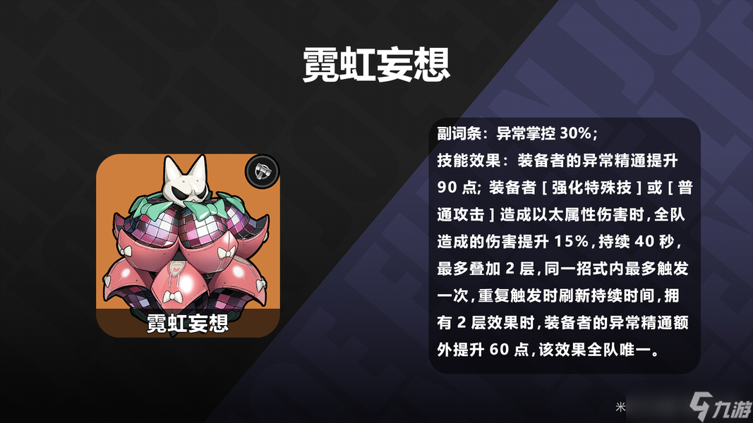 与异常或同阵营组队时触发;任意角色攻击失衡敌人的异常积蓄提升30%,连携技的异常积蓄额外提升30%,非常适合爱芮的双连携。