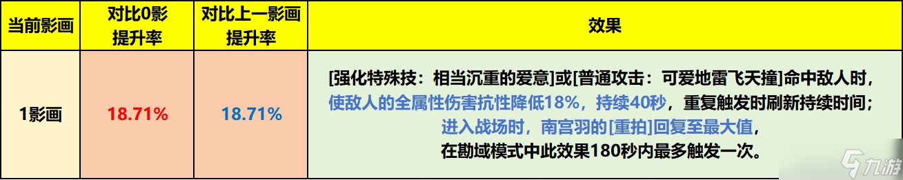 强特和蓄力普攻可使敌方全属性抗性降低18%,进入战场【重拍】回复至最大值,开局直接就能强特打满3段蓄力,大幅减少暖机时间;1影综合提升率约为18.7%。